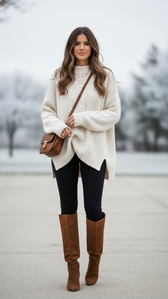 Add knee-high boots in brown leather or suede to elongate your legs and enhance the cozy aesthetic. These classic seasonal combinations work perfectly for creating timeless winter looks that never go out of style. Master essential layering techniques by tucking just the front of your sweater into your leggings, creating definition at your waist. Complete this versatile outfit with a crossbody bag and delicate jewelry for everyday elegance.