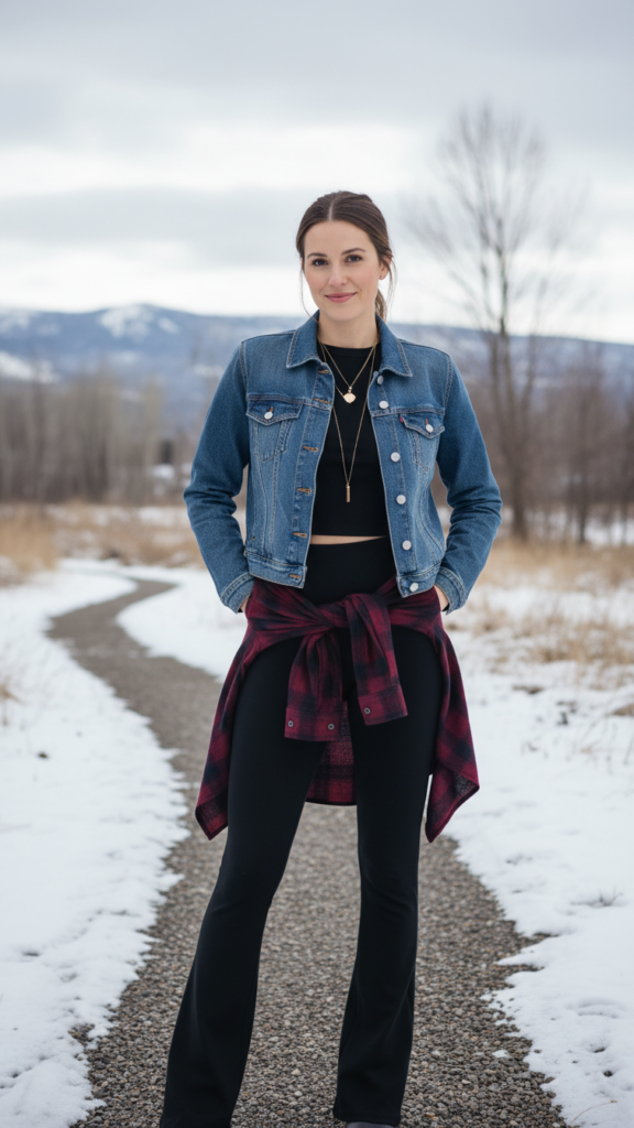 Creating effortless layers becomes simple when you combine a flannel shirt tied at your waist with a classic denim jacket over black flair leggings. This relaxed combination gives you complete freedom to move while maintaining that Pinterest-worthy aesthetic you’re craving.