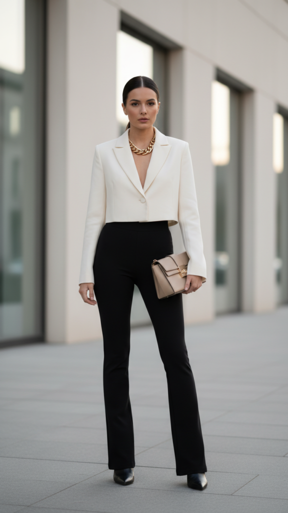 Choose a fitted bodysuit or cropped sweater that highlights your cinched waist silhouette against the flared hem of your leggings. The contrast between fitted and flared creates visual interest that’s both flattering and fashion-forward.