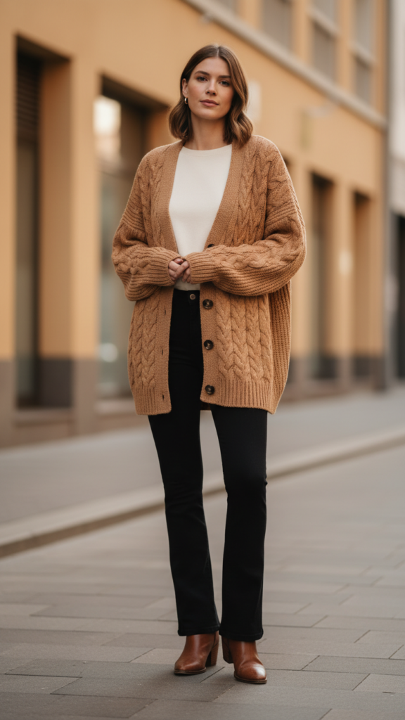 Chunky Knit Cardigan and Ankle Boots Ensemble