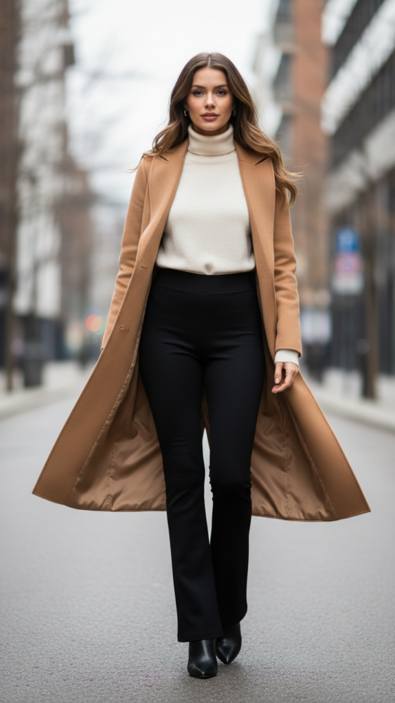 Elevating your black flair leggings from casual to sophisticated becomes effortless when you layer a fitted turtleneck sweater beneath a customized long coat. This combination creates visual height while maintaining comfort throughout your day. Choose neutral tones like cream, camel, or charcoal for your turtleneck silhouette to complement the leggings’ dramatic flare.