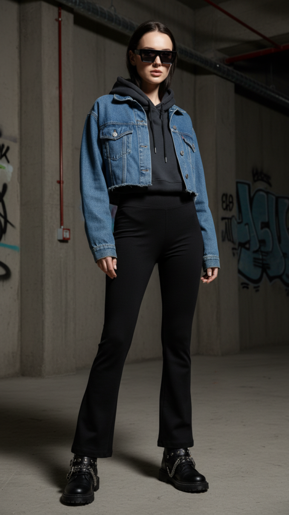 The oversized hoodie silhouette balances your leggings’ fitted flare beautifully, creating visual interest through contrasting proportions. Choose neutral tones like charcoal, cream, or classic black to maintain versatility. Layer a cropped denim jacket over your hoodie for added texture and dimension. These flared-leggings outfit combinations deliver both warmth and fashion-forward appeal during colder months.