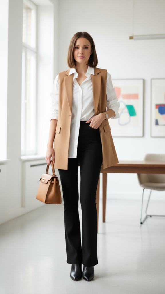 Choose an oversized silhouette vest in neutral tones like camel, cream, or charcoal for maximum versatility. The structured vest adds professionalism while maintaining comfort and movement freedom. Tuck your button-up partially into the leggings, leaving the back untucked for a relaxed, contemporary finish. This styling approach transforms casual pieces into elevated occasions appropriate attire.