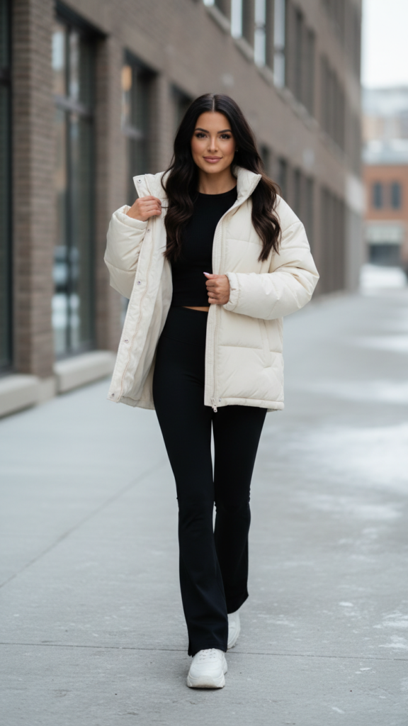 Choose an oversized puffer in neutral tones like beige, cream, or classic black to complement your leggings’ silhouette. The voluminous jacket creates beautiful contrast against the fitted flare shape, achieving that coveted heightened athleisure vibe you’re after.