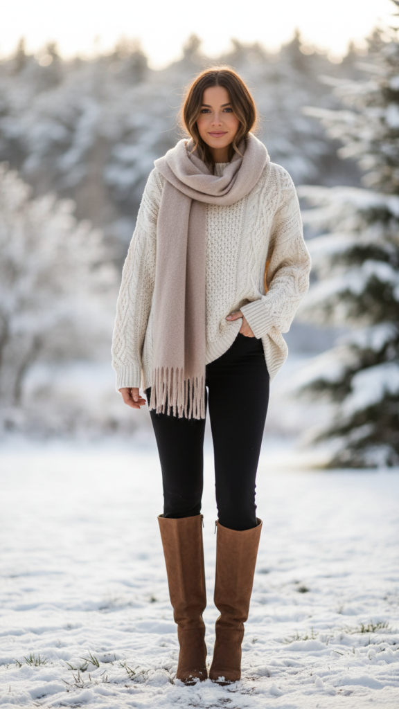 Cable Knit Sweater With Scarf and Tall Boots