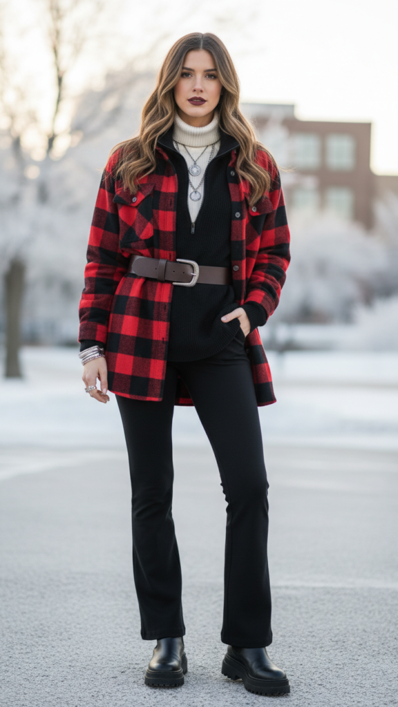 Layer your flannel over fitted basics, then add chunky jewelry or a crossbody bag to complete the ensemble. This rebellious yet refined approach gives you freedom to express your personality while staying warm and comfortable throughout winter’s unpredictable weather.