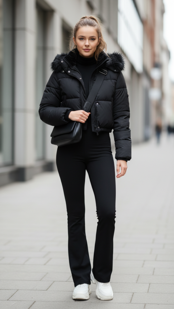The versatility of athletic-inspired fashion shines when you combine black flared leggings with a cropped puffer jacket and chunky sneakers for winter street style. This trend-forward combination gives you the freedom to move comfortably while staying warm and stylish throughout cold weather months.