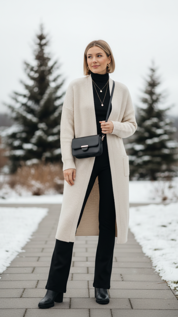 Why settle for basic layering when black flared leggings paired with a long cardigan and ankle boots create an effortlessly chic winter ensemble? This combination gives you complete freedom to move while maintaining sophisticated style throughout colder months.