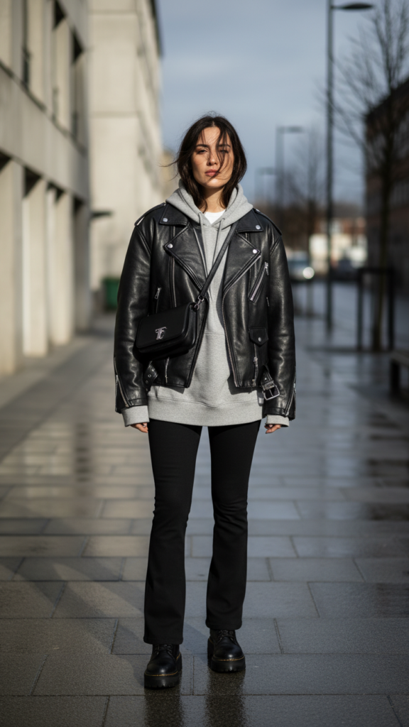 Choose an oversized hoodie in neutral tones like gray, cream, or classic black to maintain versatility in your wardrobe. The relaxed fit balances the fitted nature of your leggings perfectly. Combat boot trends currently favor chunky platforms and weathered leather finishes that add instant attitude to any outfit.
