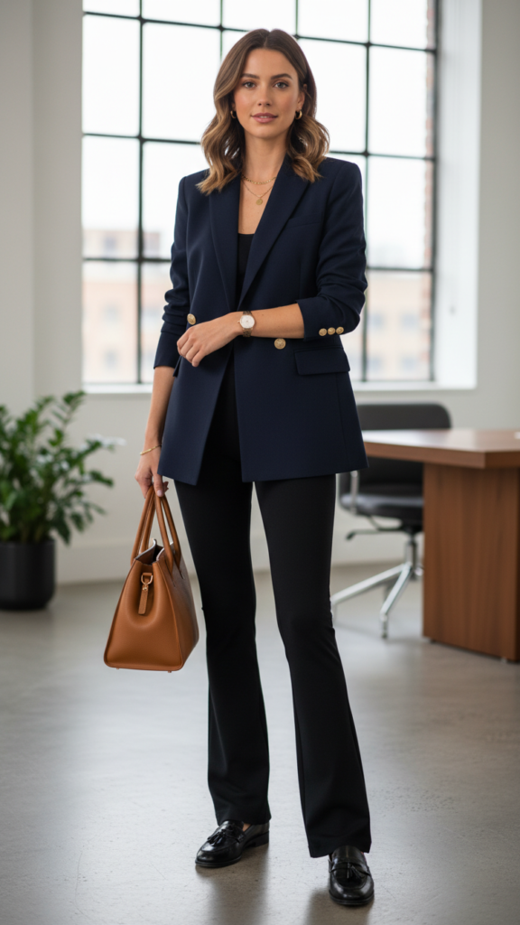 Elevating your black flared leggings from casual streetwear to workplace-appropriate attire becomes effortless with a structured blazer and polished loafers. This chic blazer pairing adapts your look into sophisticated office wear that doesn’t sacrifice comfort for style.