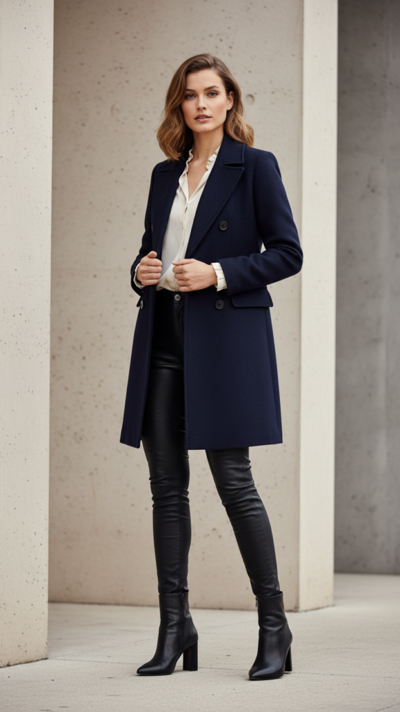 Choose a tailored wool peacoat in navy, camel, or charcoal gray to complement your leggings’ edgy appeal. The structured shoulders and fitted waist create a sophisticated aesthetic that balances the form-fitting nature of leather pants.