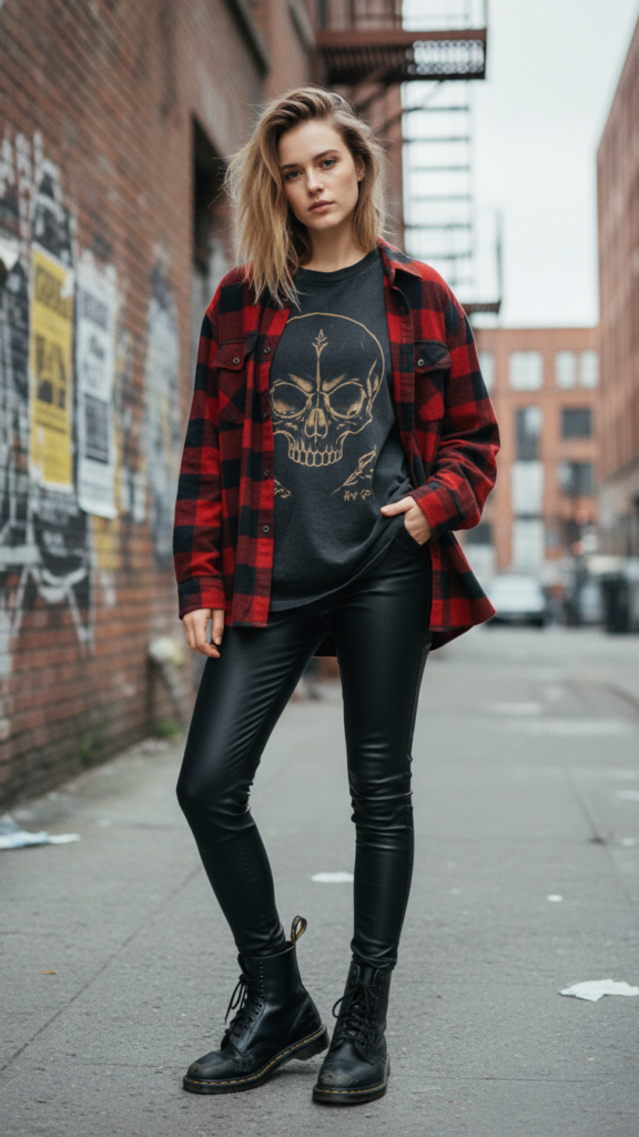 Complete your grunge chic layering with black Doc Martens—they’ll anchor the look while adding rebellious attitude. Add accessories like silver rings, a beanie, or a crossbody bag for extra personality. This combination delivers maximum impact with minimal effort, perfect for concerts or casual weekends.