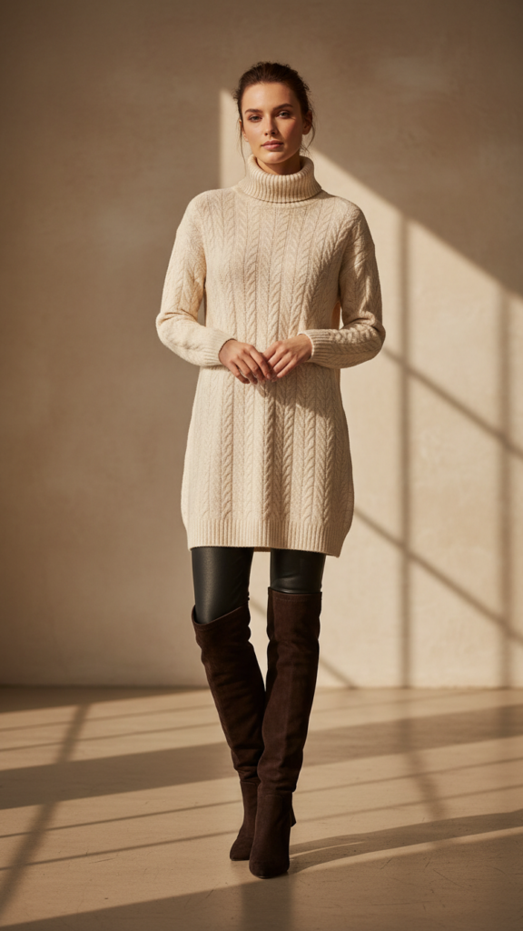Turtleneck Dress Layered Over Leggings With Tall Boots