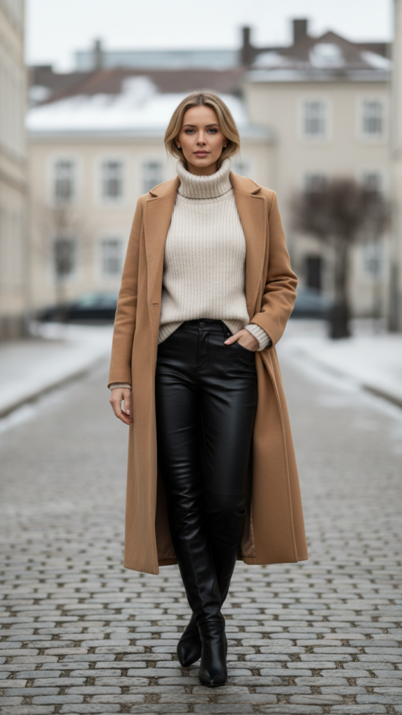 Choose a chunky knit turtleneck in cream, camel, or soft gray to balance the leather’s edginess with warmth. Your knee-high boots should complement the leggings’ sleekness—opt for suede or smooth leather in matching black tones.