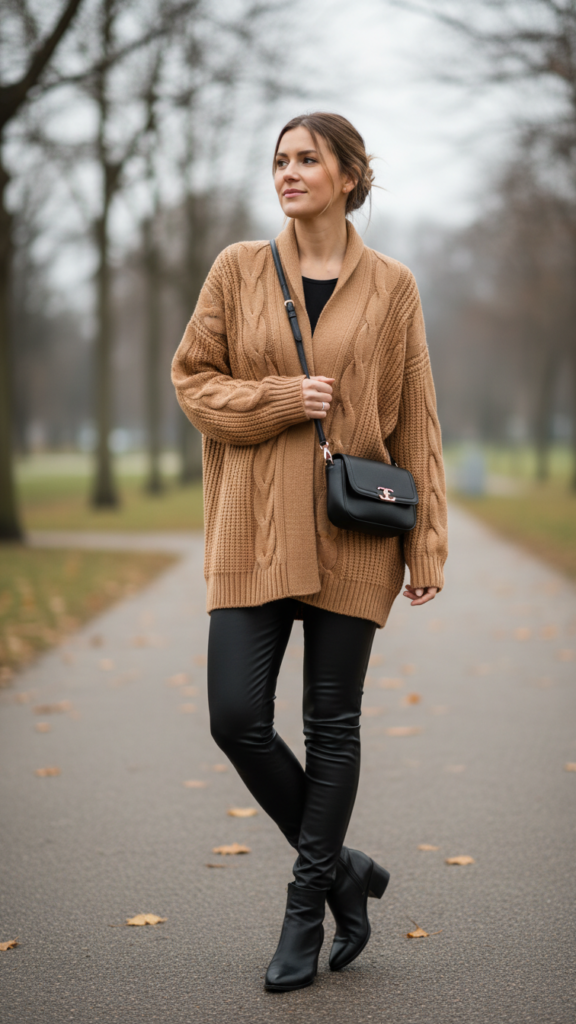 Choose oversized cardigans in neutral tones like cream, camel, or soft gray to create appealing contrast against your sleek silhouette. The chunky texture adds visual interest while providing practical warmth during colder months. These cozy layers balance the edginess of leather with approachable comfort. This cozy winter combination of leggings and boots creates the perfect foundation for staying warm while looking effortlessly chic.