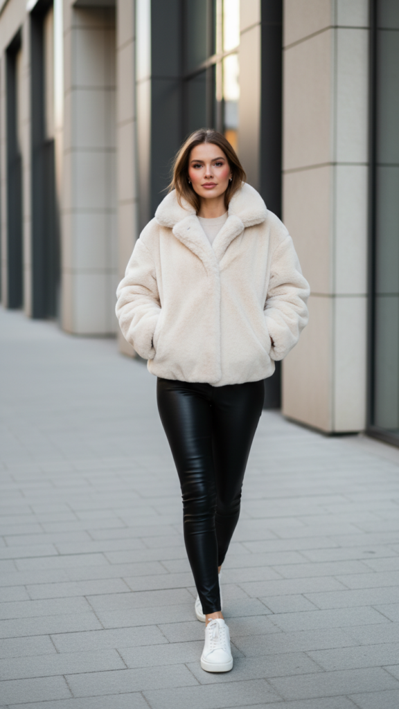 Mixing high-end textures with casual footwear creates an unexpected style contrast that defines modern urban fashion. Your faux fur jacket instantly boosts black leather leggings while white or metallic sneakers keep the look approachable and comfortable for city excursions.