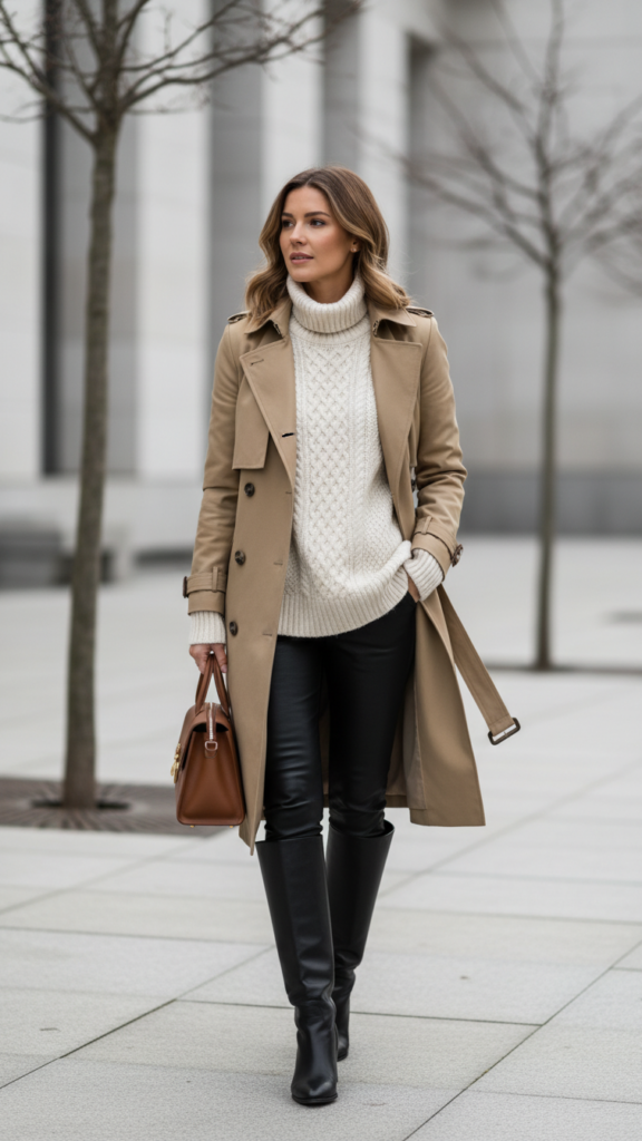 Classic sophistication takes center stage when you combine cable-knit sweaters, riding boots, and trench coats with black leather leggings for a refined casual look. This ensemble delivers heightened basics that work effortlessly from office meetings to weekend brunches.
