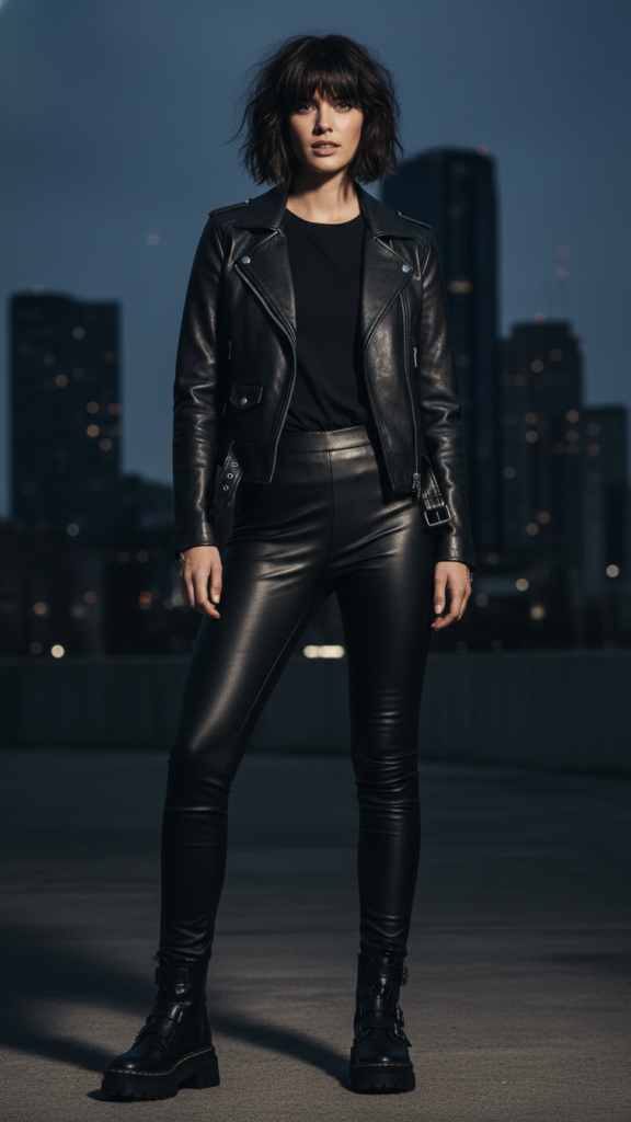 High heeled ankle boots with platform soles give you height while adding another textural element. Look for boots with buckles, studs, or contrasting stitching to enhance the rebellious aesthetic. Layer a fitted black tee underneath your jacket for balance. This outfit works perfectly for concerts, date nights, or whenever you’re feeling particularly fearless and want to make a statement.