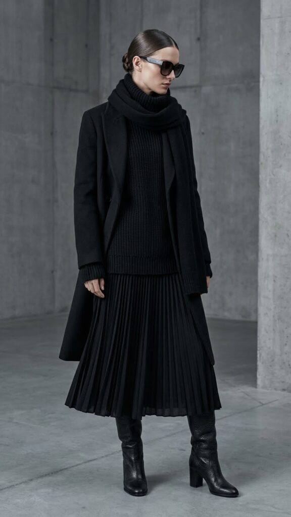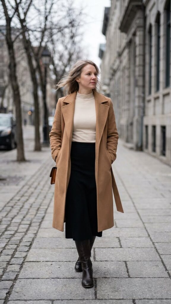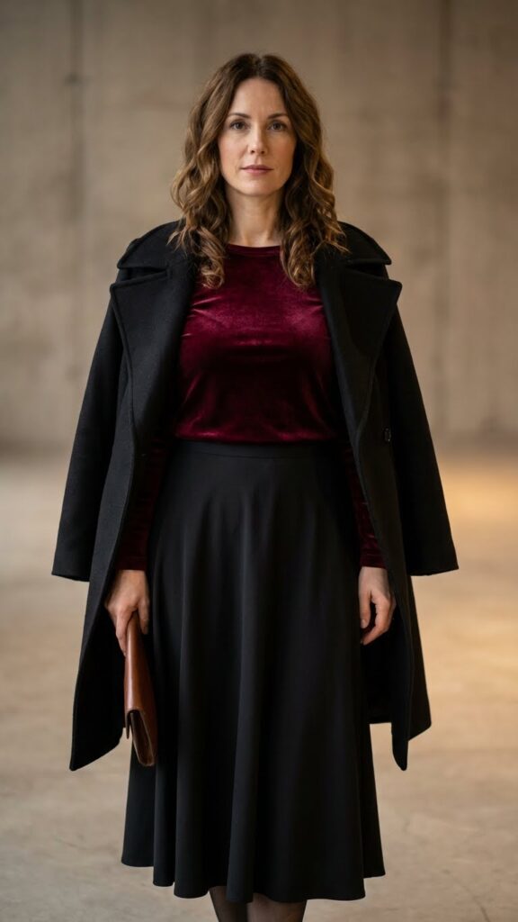 Layer your wool coat over this combination for maximum impact. A camel or black coat works particularly well, hitting at mid-thigh to balance the skirt’s length. You’ll appreciate how this outfit gives you freedom to move comfortably while looking polished and put-together throughout your busy winter days.