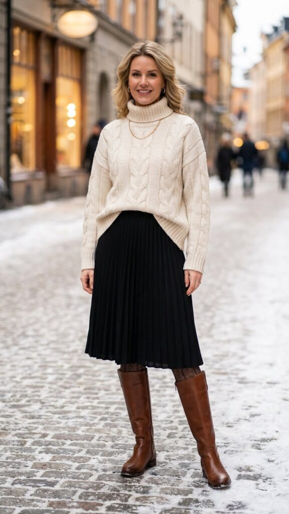 You’ll want to choose a chunky cream or oatmeal sweater that hits at your natural waist. Tuck it loosely into your skirt for a relaxed silhouette. Add patterned tights underneath for extra warmth and visual interest—herringbone or subtle geometric designs work beautifully.