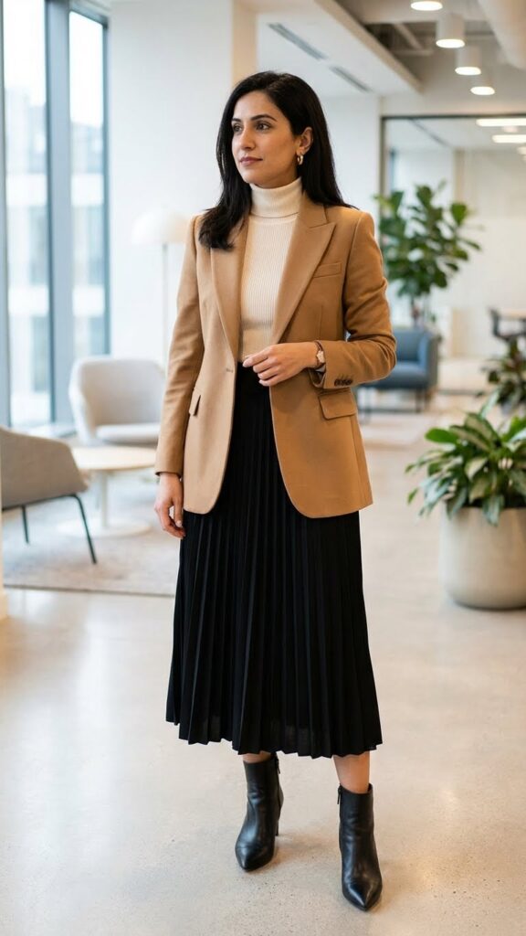 When you’re aiming for a polished professional look, the customized blazer and turtleneck combination enhances your black midi skirt instantly. This versatile pairing works perfectly for office settings or evening events where you want to make an impression.