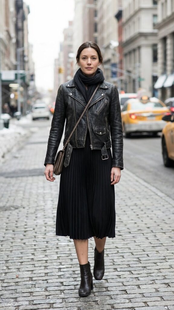 Choose ankle boots with a chunky heel for added warmth and stability on slippery surfaces. Black or brown boots work beautifully, depending on your jacket’s tone. You’ll want to add leather accessories like a crossbody bag or belt to tie the look together.