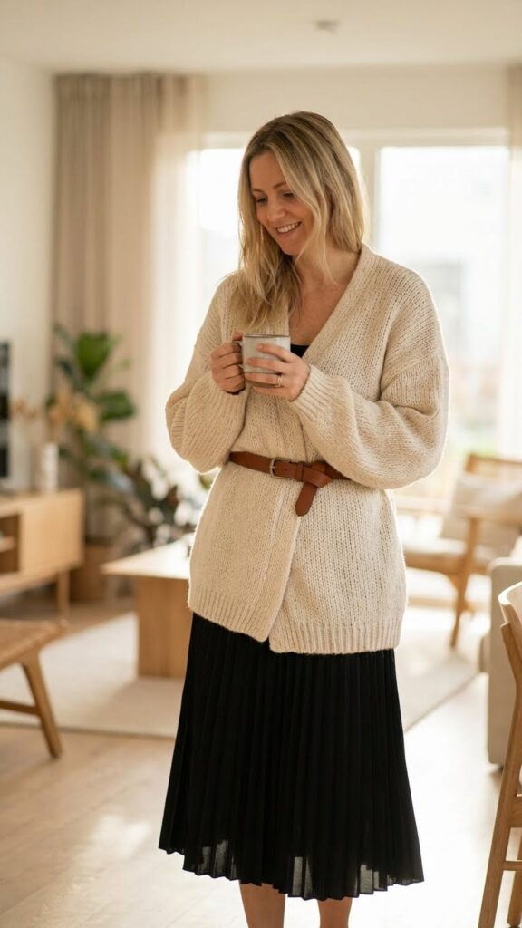 Adding a belt converts the relaxed cardigan into a belted silhouette that defines your waist beautifully. This simple accessory prevents the oversized fit from overwhelming your frame while creating visual interest.
