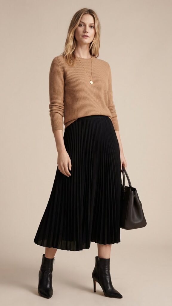 A cashmere pullover paired with heeled booties enhances your black midi skirt into a sophisticated winter outfit that’s both luxurious and practical.