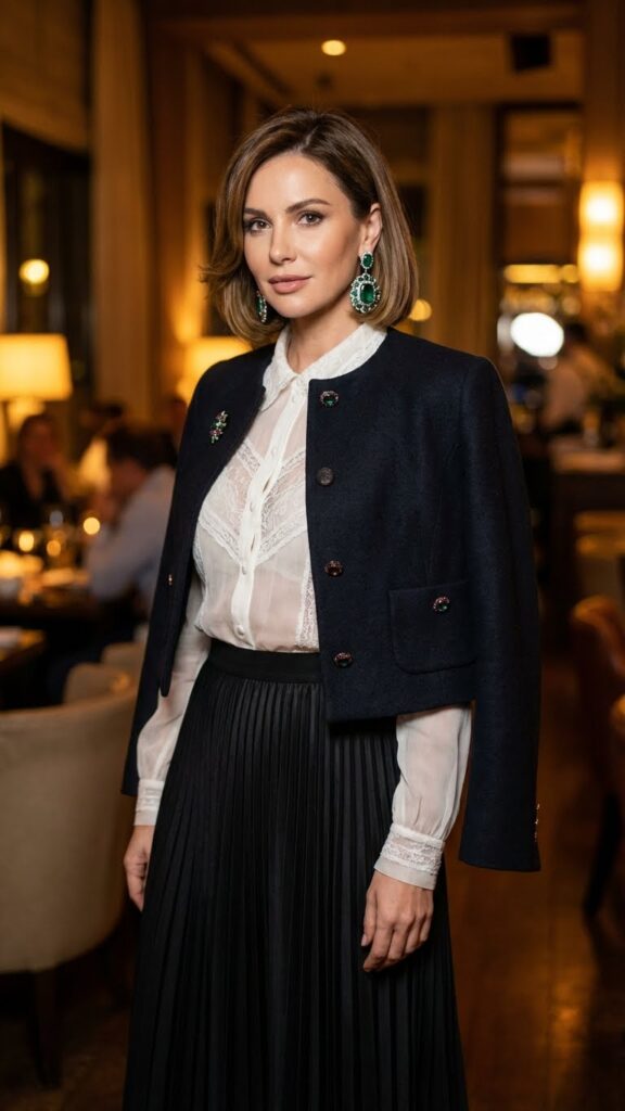 Cropped jackets offer the perfect frame for showcasing a statement blouse while keeping your black midi skirt as the outfit’s anchor. This layering technique creates visual interest at your waist while maintaining a streamlined silhouette throughout the colder months.