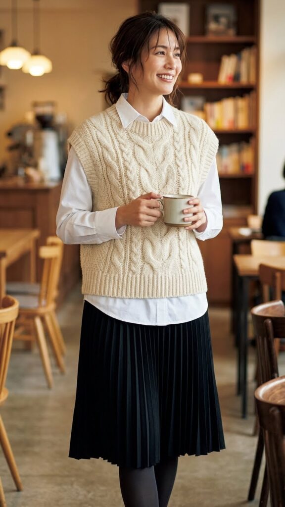 For a modern twist, try an oversized vest with a fitted shirt tucked neatly into your skirt’s waistband. Add loafers or ankle boots to complete the scholarly vibe. This combination works perfectly for office settings, weekend brunches, or gallery visits when you want effortless sophistication with practical comfort.