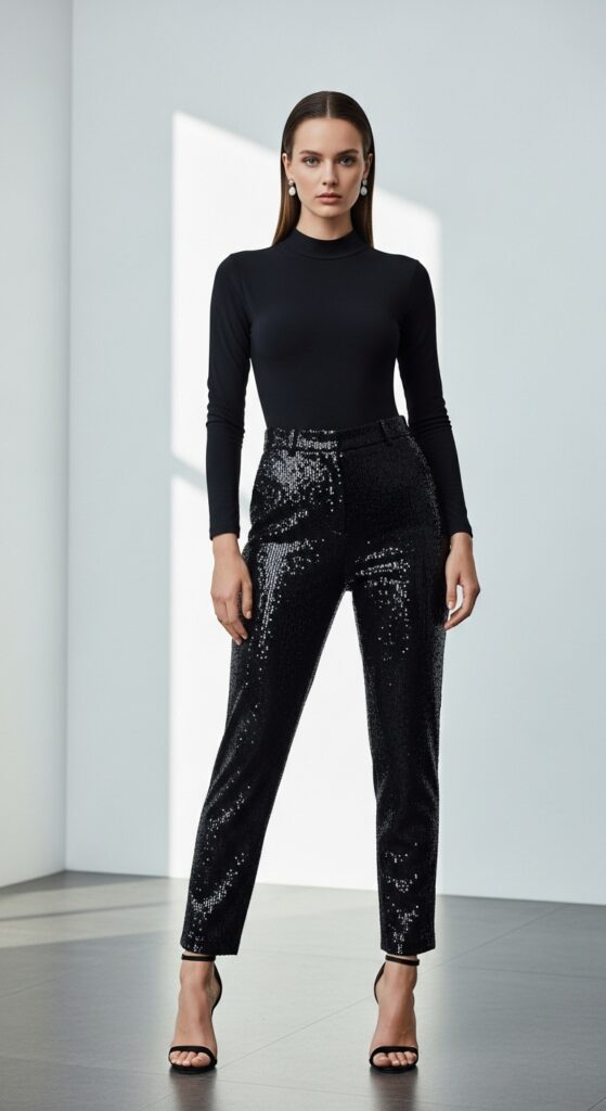 Sometimes the best accessory is simplicity. A fitted turtleneck in black paired with sequin trousers is classic, elegant, and lets the pants do all the heavy lifting. This look is all about clean lines and understated glam, and it works for basically any night-out scenario.
