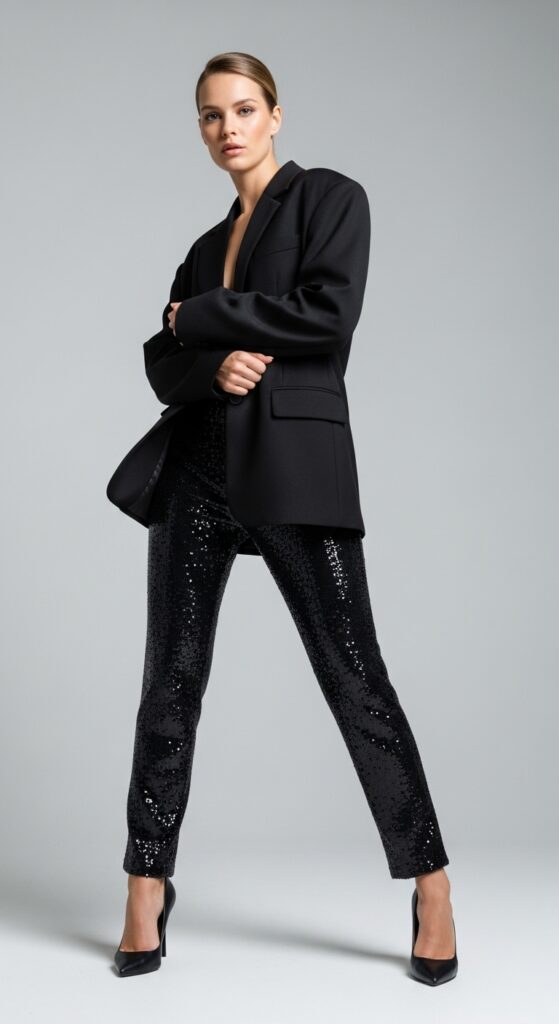 If you want to nail that whole “effortlessly cool but also very put-together” vibe, this is your outfit. An oversized blazer thrown over sequin trousers is chef’s kiss perfection. The structured, slightly masculine blazer balances out the sparkle in the best way possible, making the whole look feel modern and editorial.
