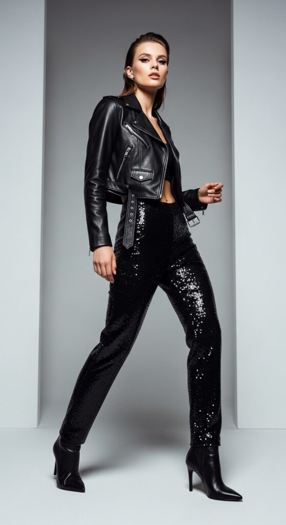 Nothing says “I know what I’m doing” quite like a cropped leather jacket paired with sequin trousers. This combo is rock-and-roll meets red carpet, and honestly, it’s one of my all-time favorite ways to style these pants. The leather adds just enough edge to balance the glam without overpowering it.