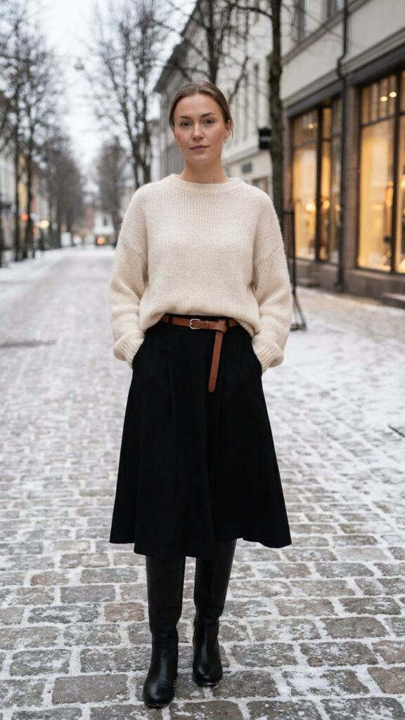 How can you achieve timeless elegance while staying perfectly warm throughout winter? A cashmere sweater paired with a knee-length black skirt creates the perfect foundation for sophisticated cold-weather dressing.