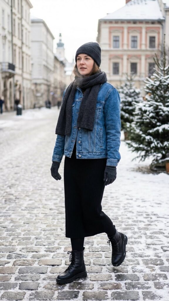 When you’re looking for a winter outfit that balances casual cool with polished style, a denim jacket layered over a black skirt delivers exactly that. This combination gives you the freedom to move between different settings without changing your entire look.
