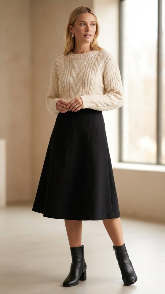 A cream cable-knit top paired with a structured black skirt creates one of winter’s most graceful yet cozy combinations. The textured knit adds visual interest while keeping you warm during chilly months. You’ll love how the soft cream shade brightens your complexion against the sleek black fabric.