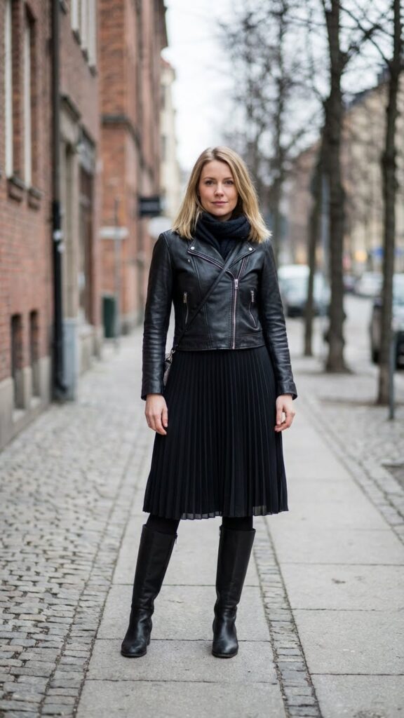 Swapping your cozy sweater for a leather jacket instantly changes your black skirt outfit from soft and relaxed to bold and edgy. A pleated black skirt creates beautiful movement while the structured jacket adds rebellion to your winter look.