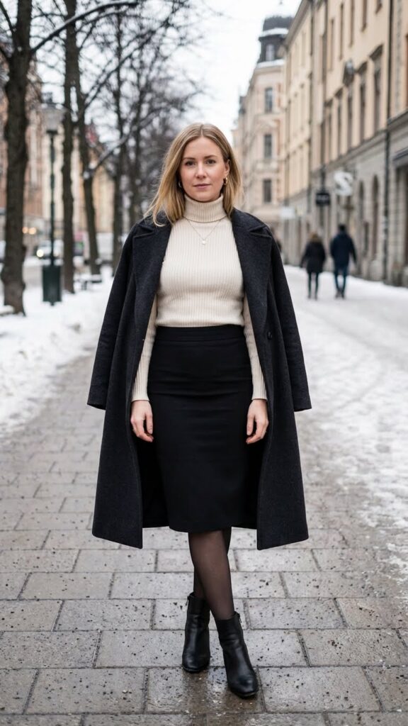 A turtleneck tucked into a pencil black skirt creates one of winter’s most polished and sophisticated silhouettes. This combination works beautifully for office settings, dinner dates, or any occasion requiring effortless elegance.
