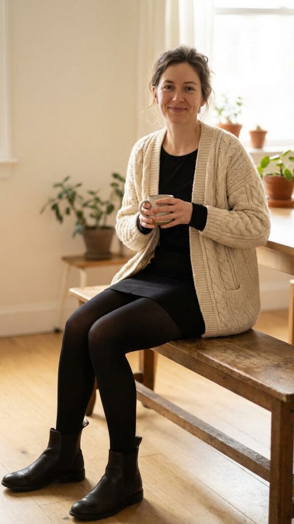 A chunky knit cardigan pairs beautifully with a mini black skirt, giving you freedom to move while staying warm. The layered textures between thick wool and sleek fabric create visual interest that catches the eye. You’ll want to choose a cardigan that hits mid-thigh for the most flattering proportions.