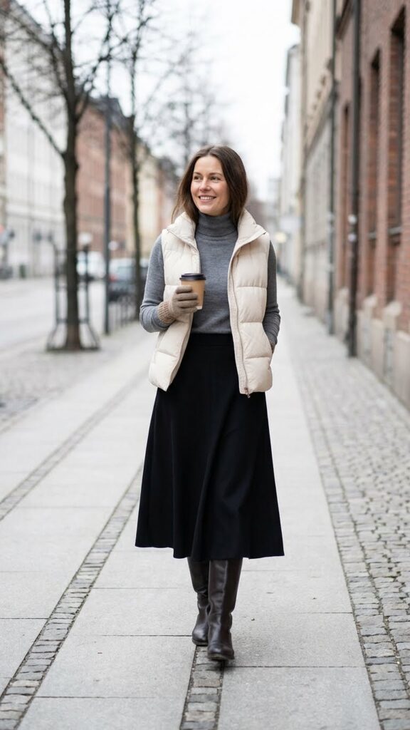 You’ll want to start with a fitted turtleneck or long-sleeve thermal as your base layer. Add your favorite puffer vest in a neutral tone like cream, olive, or camel to complement the black skirt beautifully. The cozy layers work together to trap heat without adding bulk around your hips.