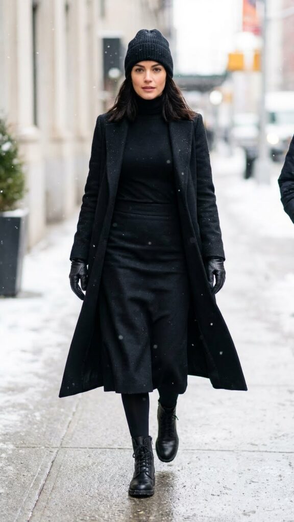 An all-black winter ensemble creates a sleek, sophisticated look that never goes out of style. You’ll love how this minimalist monochrome approach simplifies morning outfit decisions while providing maximum impact.