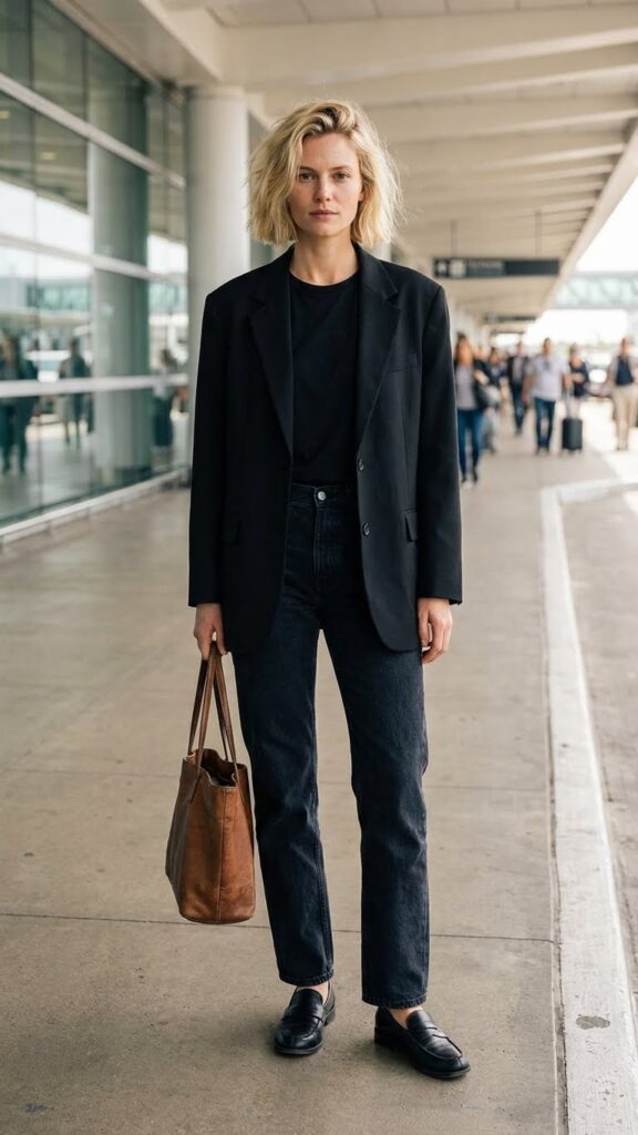 The blazer adds structure without being stuffy, and it’s perfect for layering when airplane AC decides to turn your row into the Arctic. I always go for an oversized or boyfriend-cut blazer because it feels more relaxed and less “I’m headed to a board meeting.” Finish with loafers or ankle boots and you’re set.