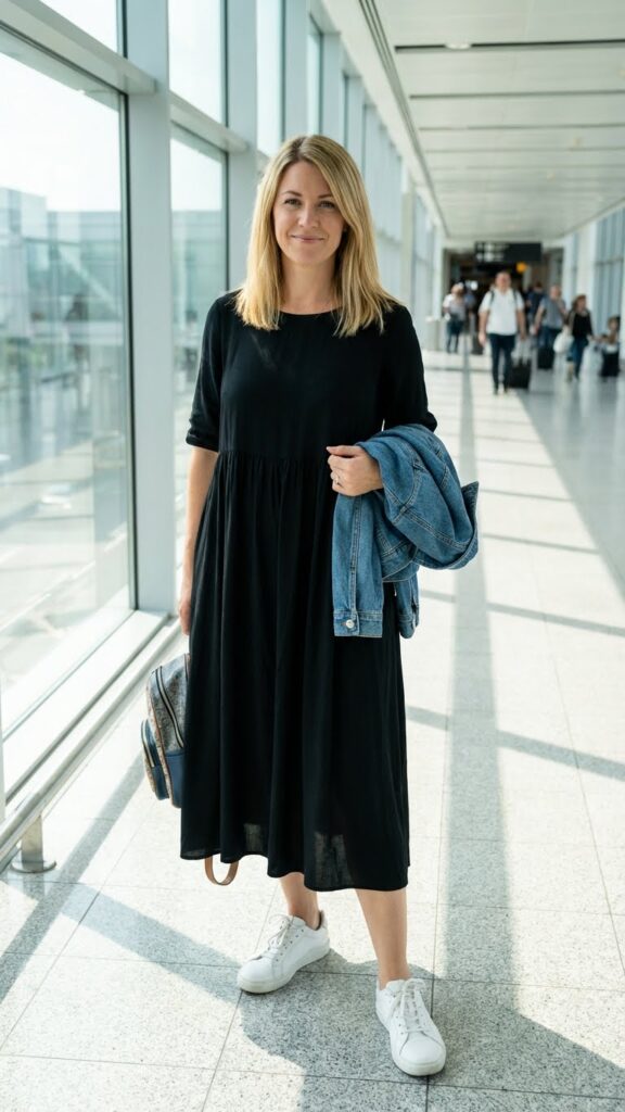 Throw on white or black sneakers to keep it casual and comfortable for walking through terminals (or cobblestone streets if you’re fancy). Add a denim jacket or cardigan for layering, and you’ve got an outfit that transitions beautifully from plane to exploring a new city.