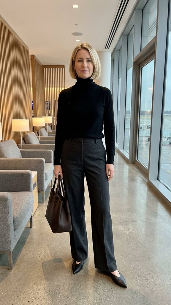 Is there anything chicer than a black turtleneck? I don’t think so. Tuck it into black wide-leg trousers, and suddenly you’re giving off major Parisian traveler vibes. This look is sleek, elongating, and surprisingly comfortable if you choose trousers with a bit of stretch.