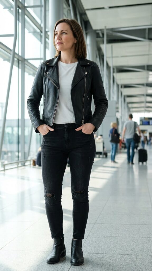 The leather jacket adds instant edge without being over-the-top, and it’s surprisingly practical for layering. Choose jeans with a comfortable rise and stretch denim because nobody wants to be uncomfortable at 30,000 feet. Finish with ankle boots or combat boots for that lived-in cool-girl aesthetic.