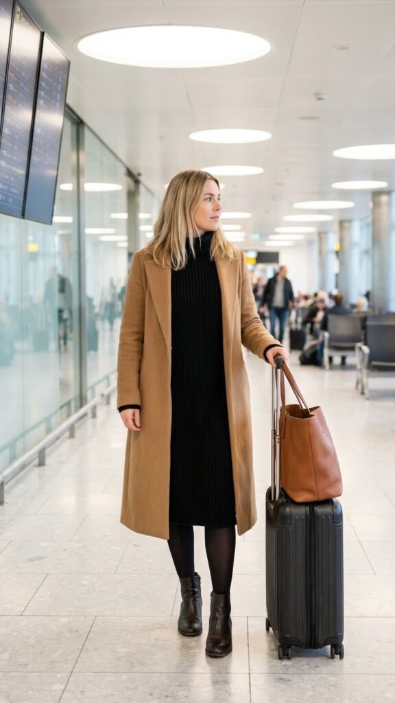 A black knit dress is cozy, chic, and travel-friendly because it doesn’t wrinkle. Pair it with knee-high or ankle boots, and you’ve got an outfit that looks polished but feels like you’re wearing your favorite sweater.