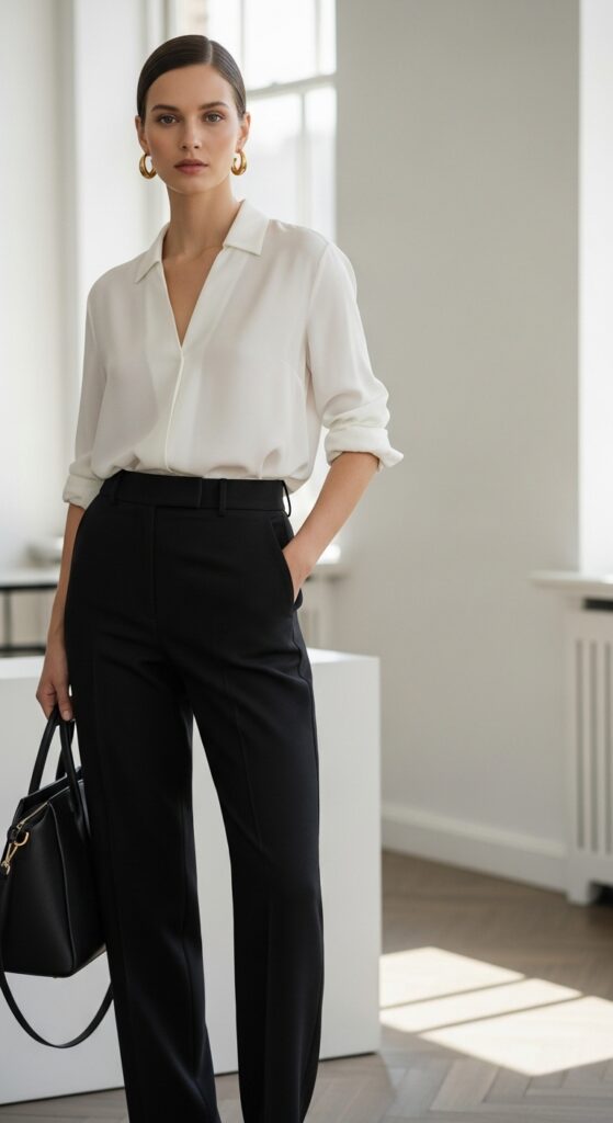 Can we start with a classic? The white blouse and black trousers combo is basically the little black dress of workwear. It’s timeless, it’s clean, and it works every single time. But here’s how you make it look expensive instead of boring: go for a silk or satin blouse with a slightly oversized fit. Tuck it loosely into high-waisted trousers for that European editorial vibe.