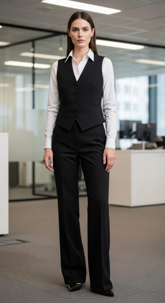 Vests are back, and I’m not mad about it. A tailored vest over a long-sleeved white shirt with black trousers is giving modern office goddess. It’s structured, it’s interesting, and it shows you understand layering as an art form.