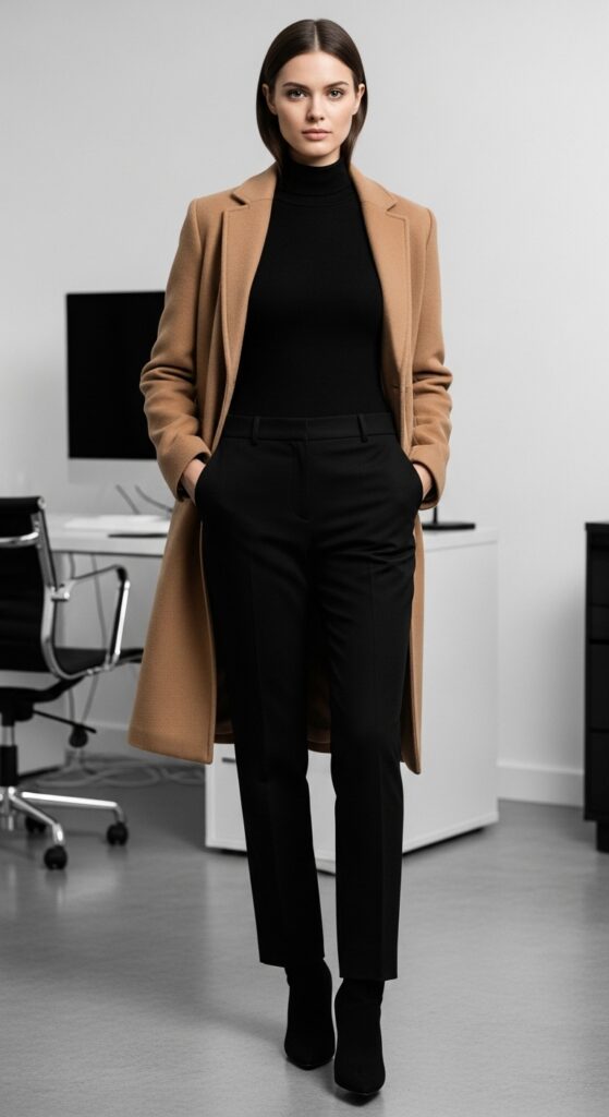 A fitted black turtleneck with black trousers is minimalism at its finest. It’s sleek, it’s sophisticated, and it requires approximately zero brain power to put together. The monochrome situation elongates your silhouette and makes you look like you have a Pinterest board dedicated to capsule wardrobes.