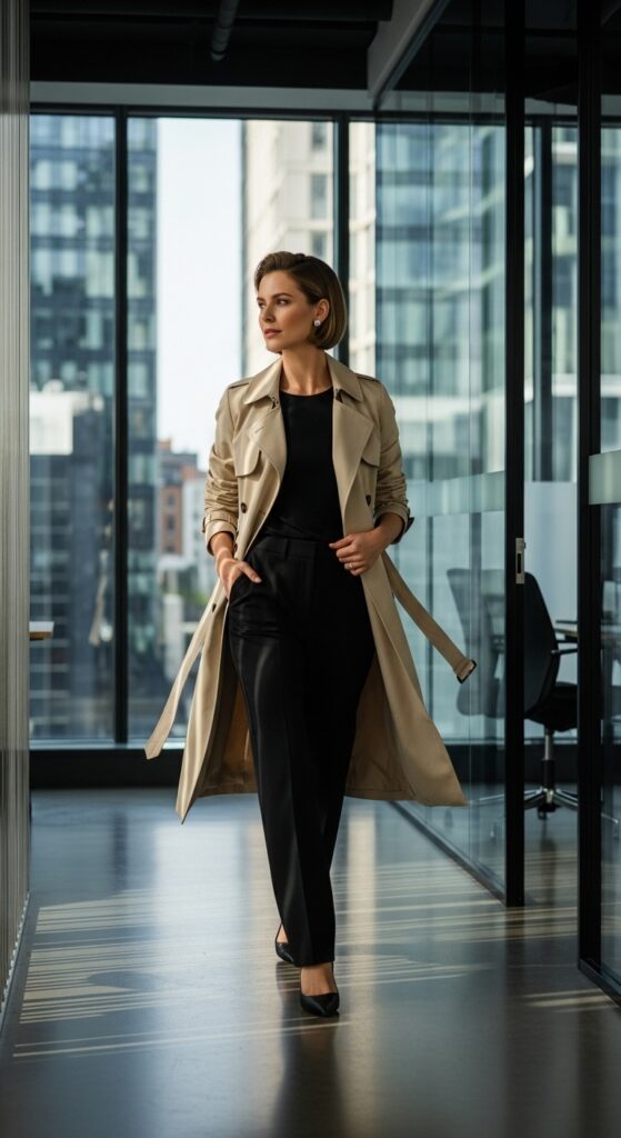 Never underestimate the power of outerwear. A classic trench coat over black trousers and a simple top is the ultimate “I have somewhere important to be” outfit. It’s timeless, it’s sophisticated, and it works for literally every body type.